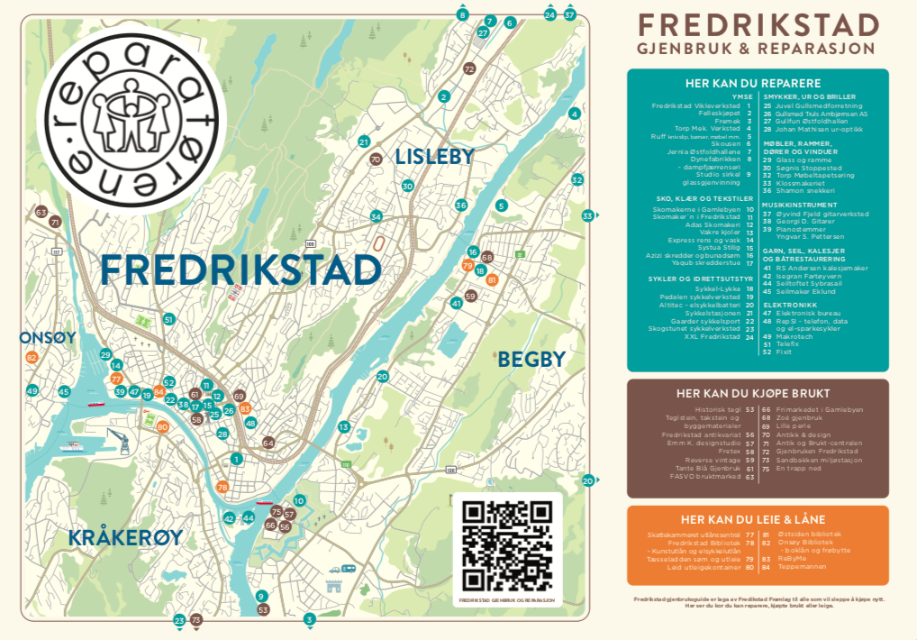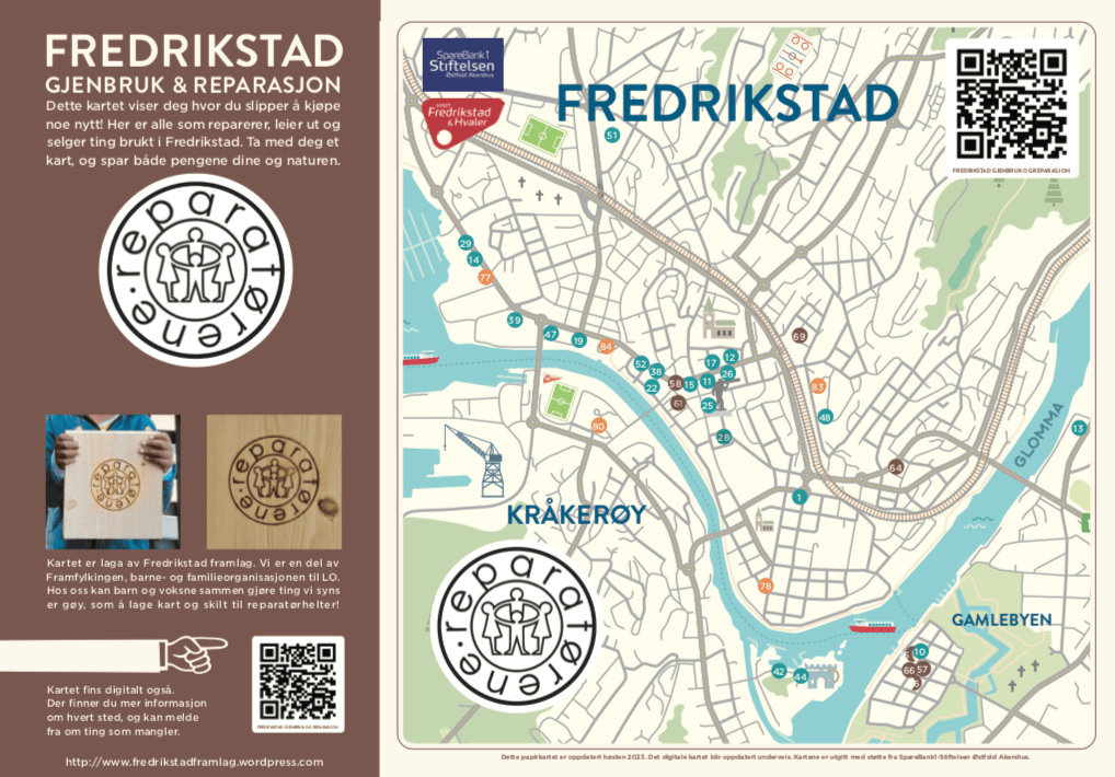 Fredrikstad gjenbruks- og reparasjonskart syner bedrifter der du ikkje må kjøpe noko nytt. Kartet er trykt på papir desember 2023. Du kan få det gratis på Visit Fredrikstad og Hvaler og hos mange av bedriftene. Om du vil ha mange kart, kan du kontakte oss. Digitalt kart finn du her.